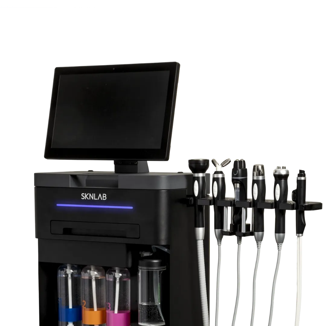 SknLab is the most comprehensive derma-facial platform available today, exclusively distributed in the United States by Cartessa Aesthetics. Unlike single-technology facials, SknLab is the only system that combines aqua-delivery with multiple energy modalities in one intelligent treatment platform. The device features six unique handpieces, each engineered to address specific aspects of skin health, working synergistically to deliver results that no single modality can achieve alone.